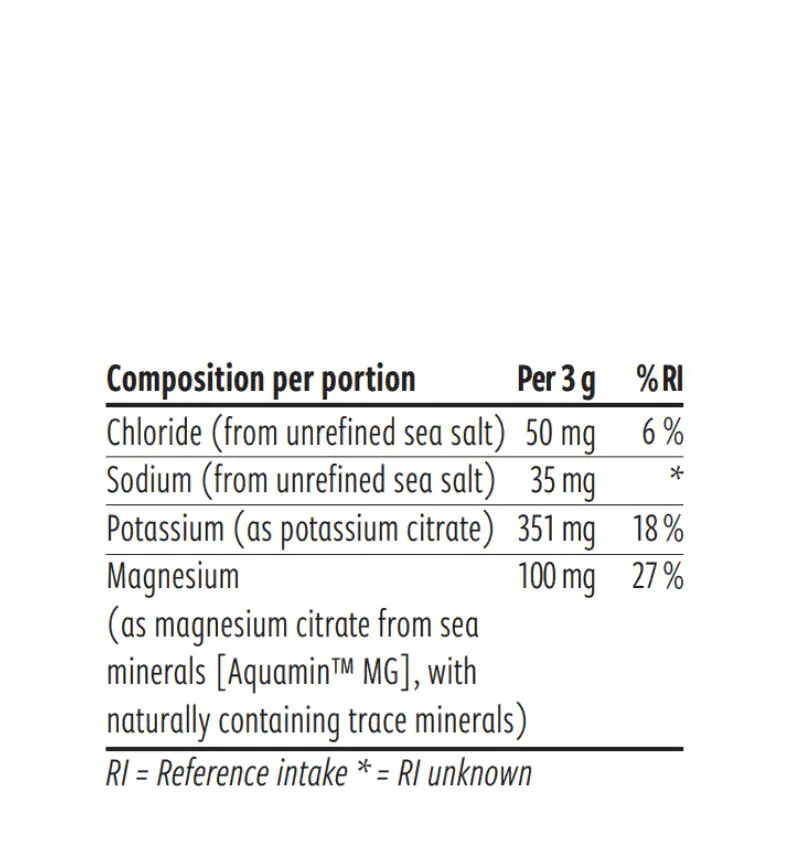 kaliumcitraat, magnesiumcitraat uit zeemineralen (Aquamin™ Mg), glycine, natuurlijke smaaktstoffen, ongeraffineerd zeezout, zuurteregelaars: citroenzuur, appelzuur, zoetstof: steviolglycosiden van stevia.