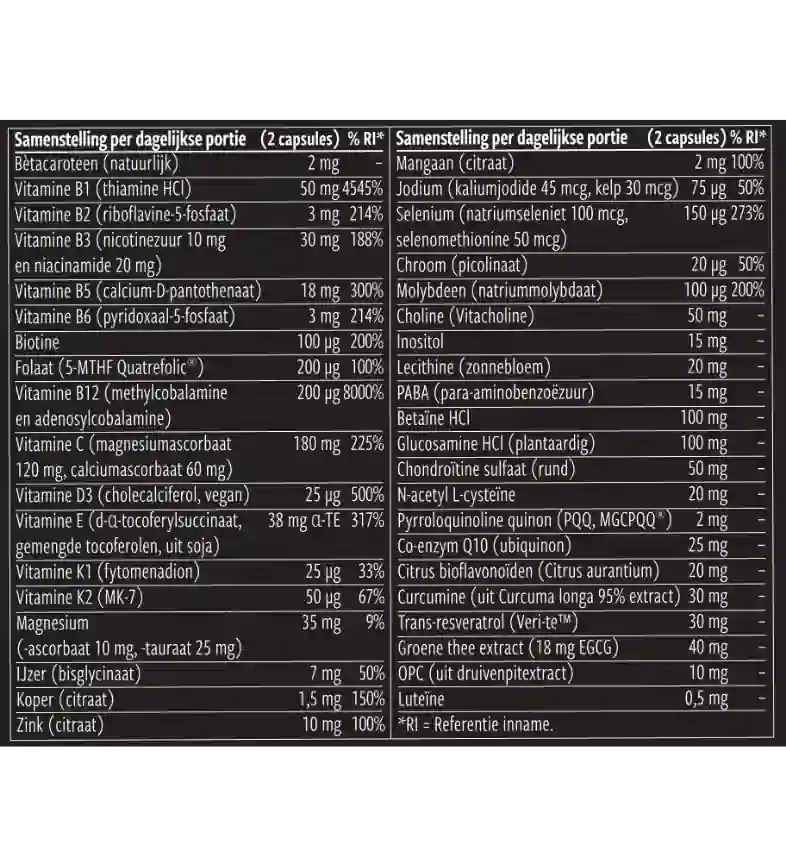 Vitaminen, mineralen, vegacapsule (HPMC), vitacholine, d-glucosamine HCl, vulmiddel (rijstbloem), antiklontermiddel (MCT-poeder van kokosnoot, Nu-flow rijstconcentraat) betaine, chondroïtine sulfaat, groene thee extract, lecithine, bioflavonoïdencomplex, resveratrol, curcumine granulaat, bètacaroteen, co enzyme Q10, inositol, OPC (druivenpitextract), luteïne, pyrroloquinoline.